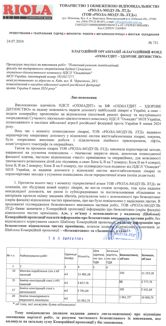 Також на тендер подала пропозицію фірма «Ріола-модуль», яка будувала цей корпус і яка після удару ракетою вже встигла безкоштовно виконати ремонт так званих «чистих приміщень» (там, де необхідна стерильність, наприклад, операційні). Вже частково замінені конструкції стін та стель, пошкоджений лінолеум. Про це фірма повідомила в листі, який завантажила у складі своєї пропозиції.