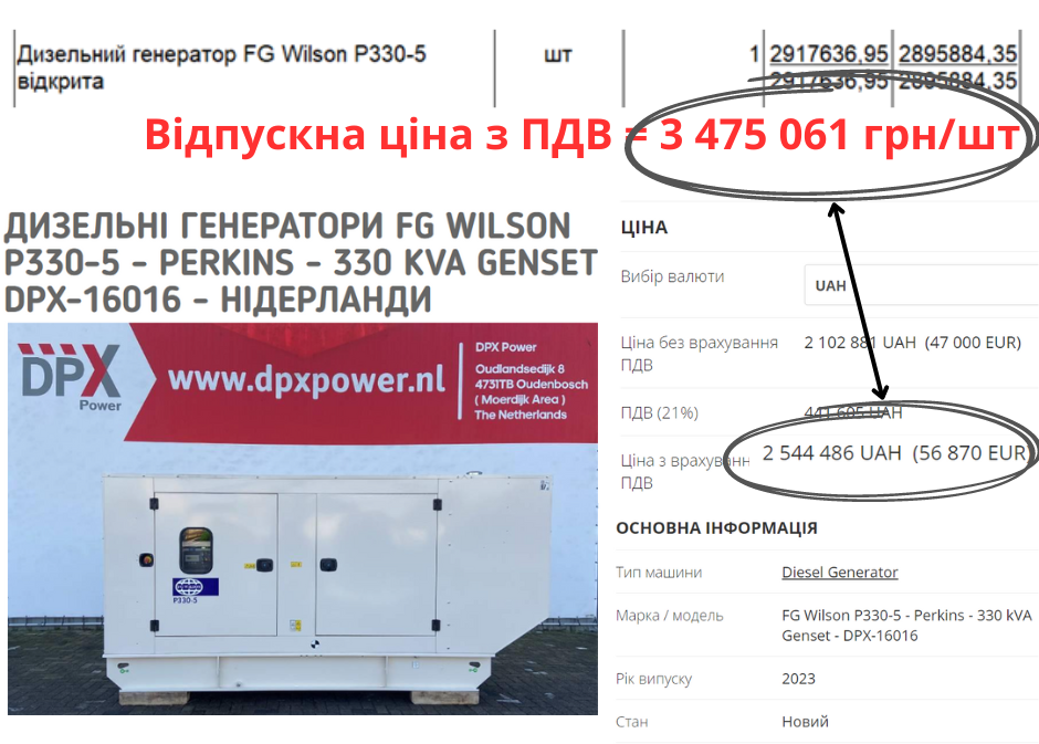 Дизельний генератор FG Wilson P330-5 врахували за 3,48 млн грн, а інтернет магазин «Mascus» продає такий за 2,54 млн грн, що на 27% дешевше.
