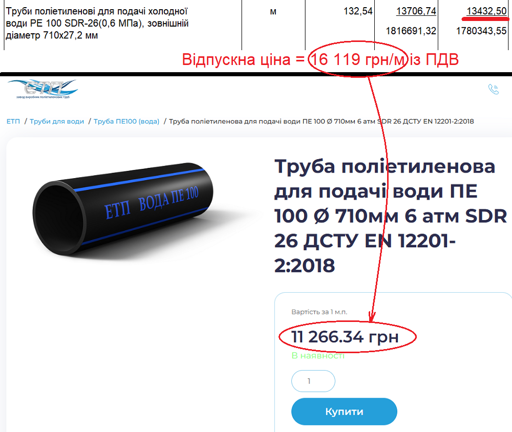 Поліетиленова труба для холодної води РЕ 100 SDR-26 710х27,2 мм коштує 16 119 грн/м, тоді як український виробник «Євротрубполімер» пропонує таку трубу по 11 266 грн/м, що на 30% дешевше. З іншими розмірами подібна ситуація (повний перелік у таблиці нижче).