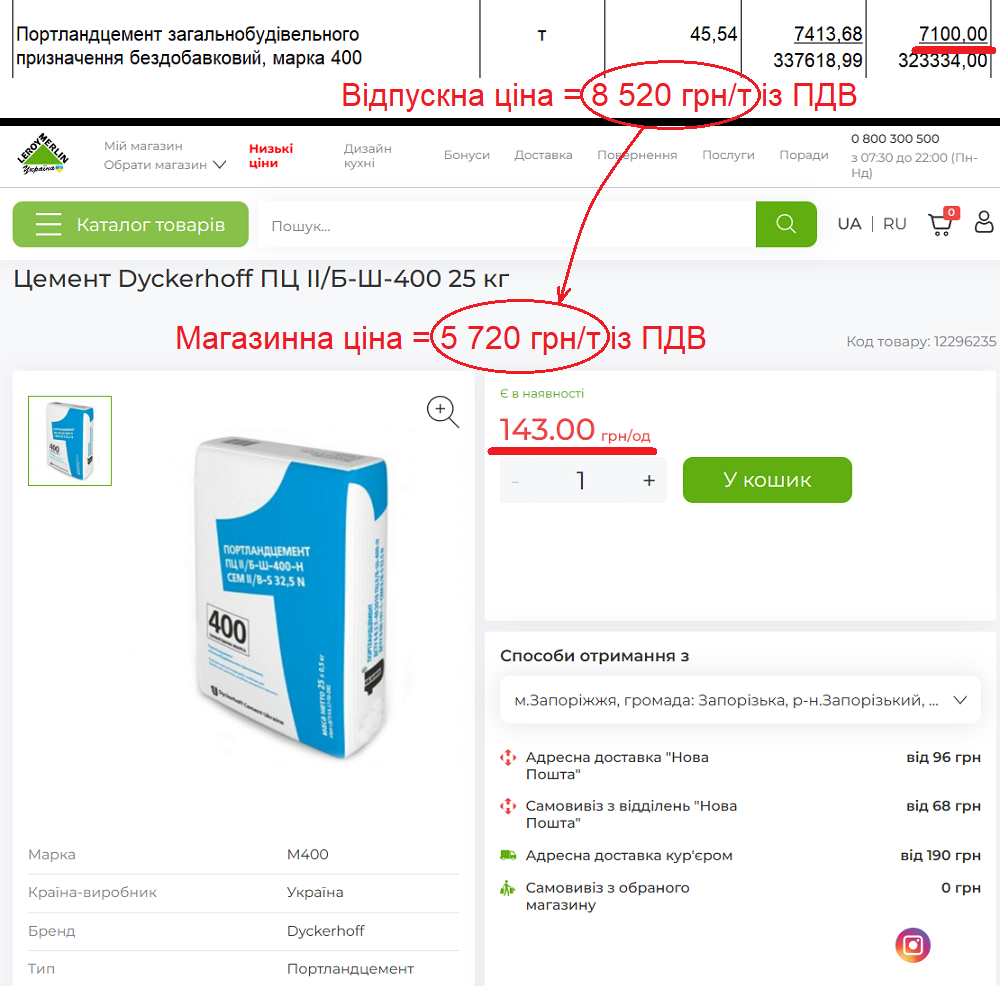 Портландцемент загально-будівельного призначення марки 400 без добавок врахували по 8 520 грн/т. «Леруа Мерлен» продає портландцемент Dyckerhoff ПЦ II/Б-Ш-400 у мішках вагою 25 кг по 5 720 грн/т, що на третину дешевше. У прайсі самого «Дікергоффа» цемент ПЦ ІІ/Б-Ш-400-Н або ПЦ ІІ/Б-Ш-400 у мішках вагою 25 кг ще дешевший – 5 172 грн/т.