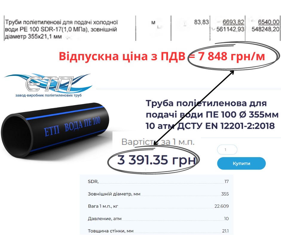 Третина вартості підряду, а саме 2,67 млн грн припадає на поліетиленові труби для холодної води РЕ 100 SDR-17. Їхні ціни у підсумковій відомості ресурсів у 2-3 рази вищі від ринку.