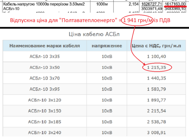 Що ж до будівельних матеріалів, то найбільша сума 4,18 млн грн припадає на кабель АСБл-10 3х50 по 1 941 грн/м. Це трижильний броньований алюмінієвий кабель під напругу 10 кВ.