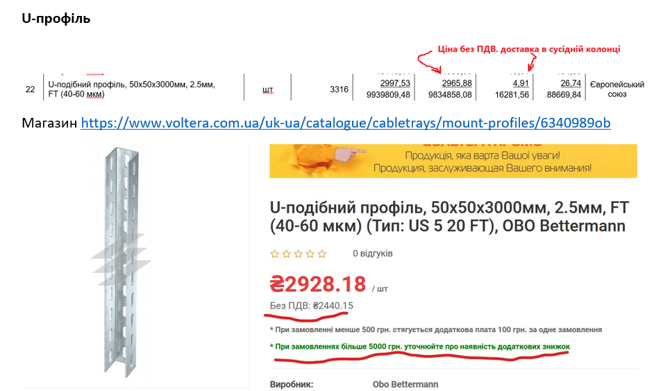 U-подібний профіль розміром 50х50х3000, 2,5 мм FT (40-60 мкм) в кошторисі вказаний по 2 966 грн за штуку без урахування ПДВ. Магазин Voltera без урахування податку продає його по 2 440 грн. І це без урахування гуртової знижки, яку магазин надає на партії розміром понад 5 тисяч гривень. А в кошторисі «Теплоенергоавтоматики» на цей профіль відведено майже 10 млн грн.