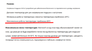 Але анонімний скаржник надав технічні характеристики на китайські грілки з максимальною температурою 65°C. І хоча в доданому документі від виробника зазначено, що «реакція не буде виробляти тепло понад безпечну температуру для людської шкіри, зазвичай близько 40-55°C», це все одно вище ніж в специфікації МОУ.