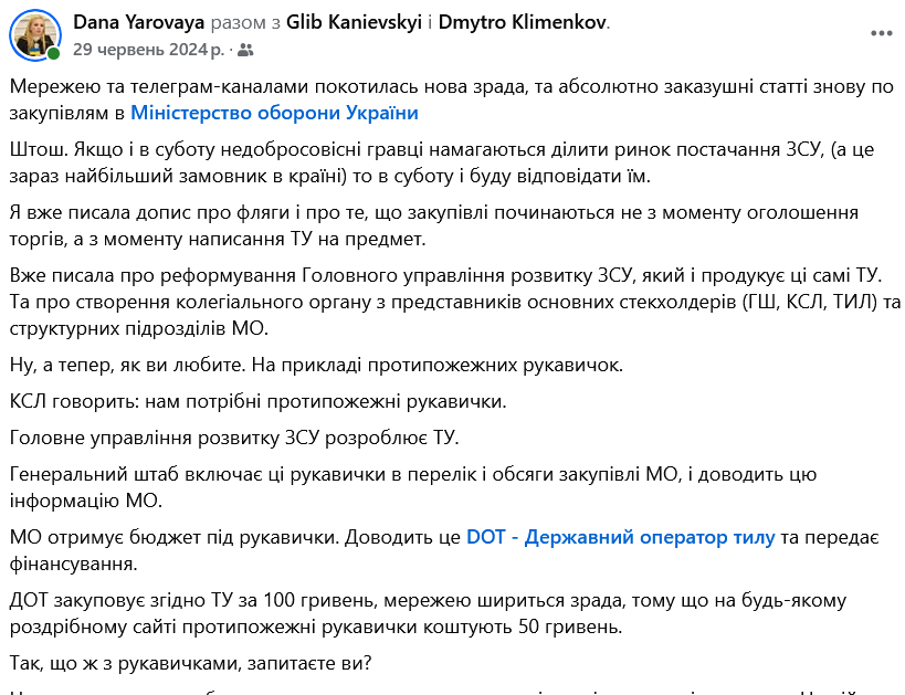 Під час проведення минулорічного тендеру ДОТом радниця замміністра оборони Дана Ярова писала, що техспецифікація, за якою купували протипожежні рукавички, містить «корупційну складову». І це може призвести до суттєвого завищення ціни. Тому вона обіцяла, що «як було, так вже не буде, всі ТУ будуть переглянуті».