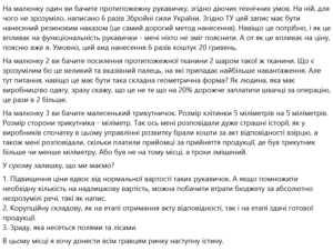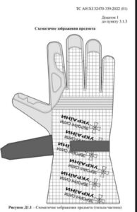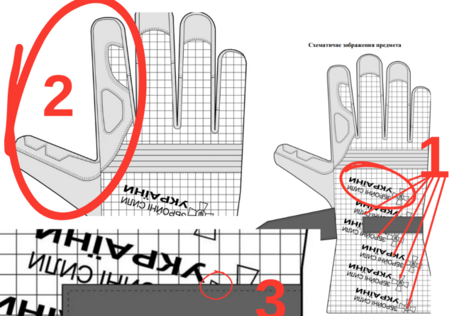 - на зображенні тильної сторони рукавиці шість разів продубльовано напис Збройні сили України. Згідно ТУ цей запис має бути нанесений методом, який збільшує вартість одиниці;