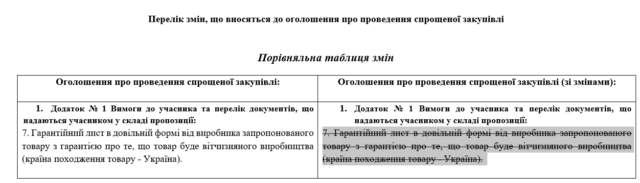 Серед іншого учасники закупівлі мали підтвердити наявність матеріально-технічної бази та працівників — мінімум одне виробниче приміщення з 20-ма швейними машинками, такою ж кількістю швачок, технологом, розкрійником/закрійником, контролером якості. Також потрібно було підтвердити наявність досвіду виконання аналогічних договорів за останні три роки в обсязі 30% від очікуваної вартості та дохід за 2023 рік або останній період поточного року на суму не менше 30 %.