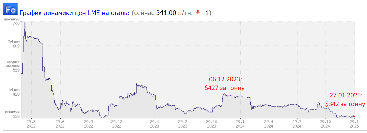 У грудні 2023 року «Укрзалізниця» без торгів замовила ТОВ «Мінерфін-транс» рейки по $1 848 із ПДВ за тонну. Це на 39% дорожче від нинішньої ціни китайських рейок. При цьому відтоді ціна сталі на біржі «LME» знизилась на 20% – із $427 до $342 за тонну.