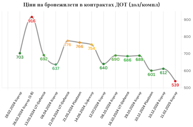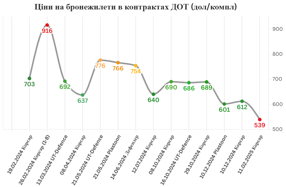 Ціна за комплект у лютневому контракті склала 22 499 грн (або $539). Це дешевше, ніж у грудні 2024 року, коли ДОТ купував такі ж бронежилети по 25 439 грн ($612).