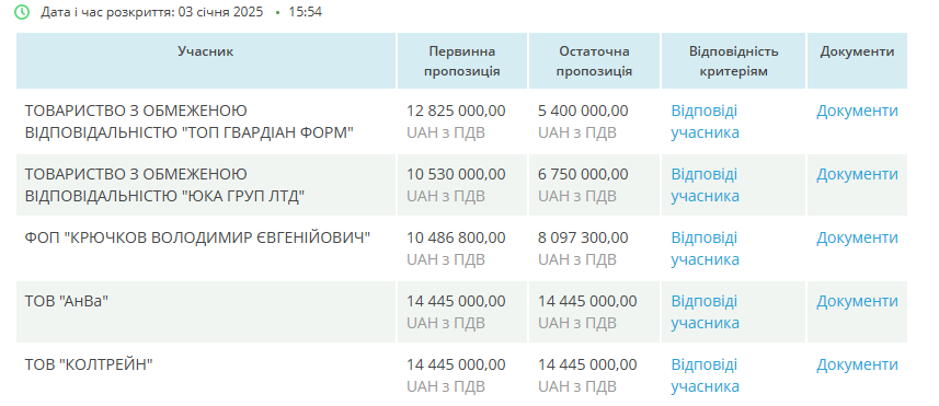 Наприклад, у лоті, де економія склала 44%, ДОТ відхилив дві ще дешевші пропозиції: ТОВ «Топ Гвардіан Форм» із знижкою 63% і ТОВ «Юка Груп ЛТД» із ціною на 53% нижчою за очікувану.
