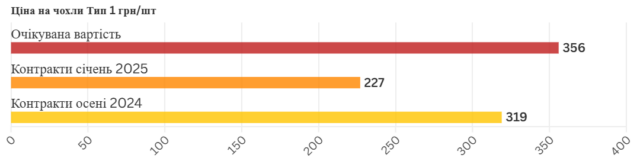 За результатом торгів середня ціна звичайних чохлів Типу 1 склала 227 грн, що забезпечило 36% економії. Для порівняння, в осінніх закупівлях ДОТ середня ціна на такі чохли склала 319 грн/шт, а знижка на торгах була 5%.