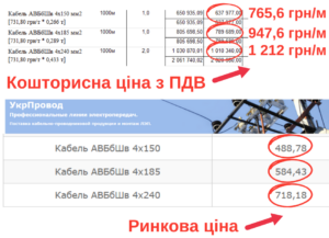 Кабель АВБбШв 4х240 вписали по 1 212 грн/м. «Укрпровід» продає його по 718 грн/м, «Агарт» – по 800 грн/м, «Електровоз» – по 830 грн/м, а «Енергоальянс» – по 856 грн/м, що дешевше на 29-41%.