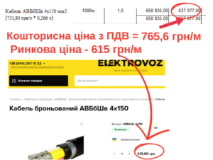 У кошторис кабель АВБбШв 4х150 вписали по 766 грн/м (тут і далі ціни та суми вказано з ПДВ).Водночас «Укрпровід» продає його по 489 грн/м, «Енергоальянс» – по 566 грн/м, а «Електровоз» – по 615 грн/м, що дешевше на 20-36%.