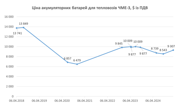 У 2022-2023 роках ціни батарей для «Дніпропетровського тепловозоремонтного заводу» та «ЦЗВ» від різних фірм складали 360–366 тис грн, або $9 877-10 009. Це дорожче, ніж зараз.