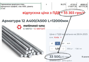Арматуру класу А500 діаметром 12-25 мм врахували по 49 639-55 303 грн/т (тут і далі ціни вказані з ПДВ). «Метінвест СМЦ» продає таку арматуру зазначених діаметрів по одній ціні – 33 500 грн/т, що на 33-39% дешевше.