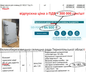 Захисні двері для сховищ ДСВ(З)Г Од 21-12 (ДУ-ІV) замовили по 300 000 грн/шт. Компанія «Будівельне постачання» продає герметичні двері ДУ-IV по 93 700 грн/шт, що втричі дешевше. Нещодавно Великоберезовицька селищна рада Тернопільської області замовляла посилені герметичні двері ДУ-ІV для укриттів (100 кПа) по 76 584 грн/ шт без ПДВ.