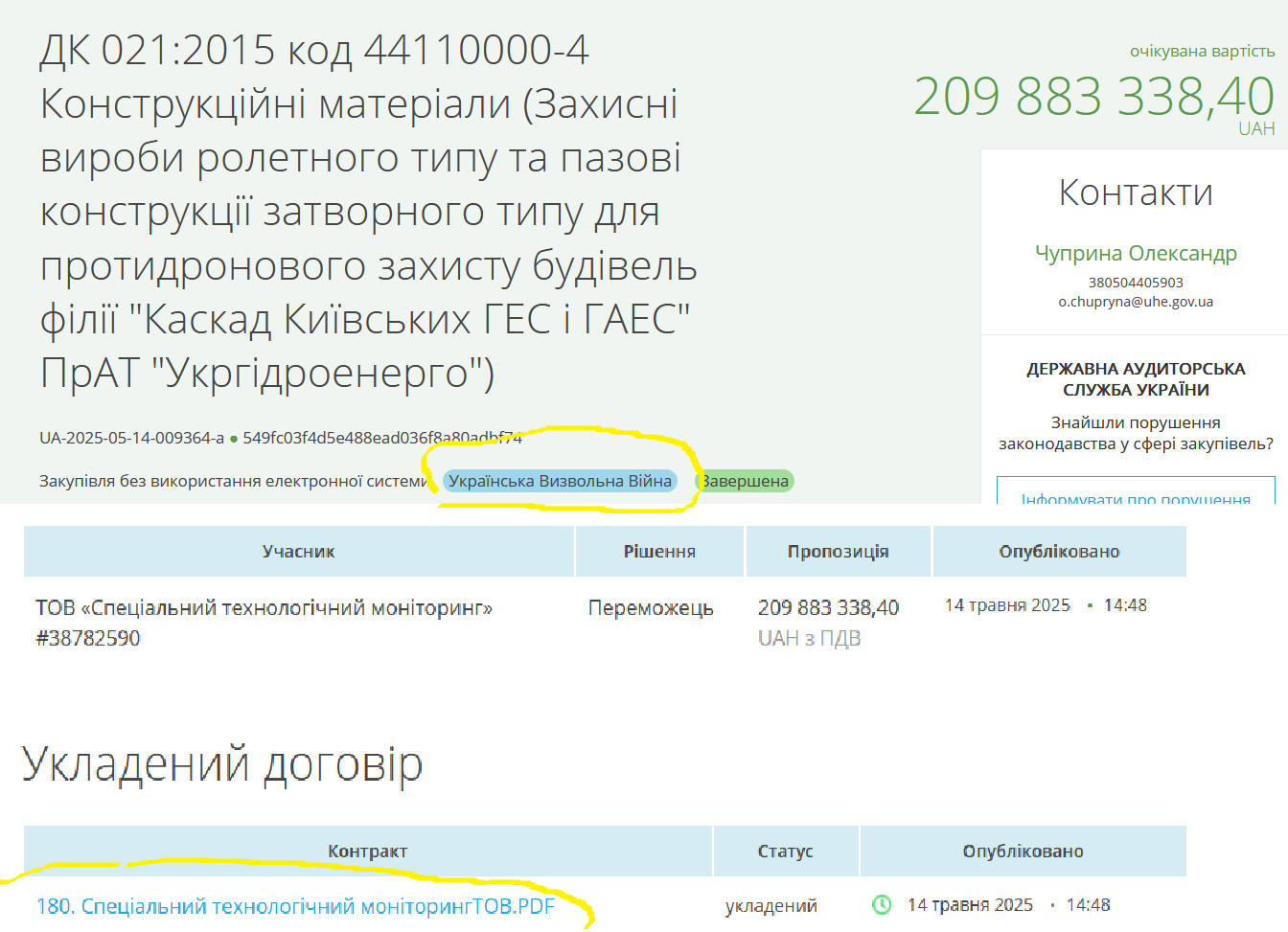 10. ПрАТ «Укргідроенерго» | 209,88 | ТОВ «Спеціальний технологічний моніторинг» | Захисні вироби ролетного типу та пазові конструкції затворного типу для протидронового захисту UA-2025-05-14-009364-a-b1 |