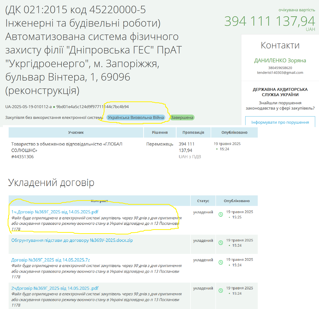 1. ПрАТ «Укргідроенерго» | 394,11 | ТОВ «Глобал Солюшнс» | Автоматизована система фізичного захисту філії «Дніпровська ГЕС» ПрАТ «Укргідроенерго», м. Запоріжжя, бульвар Вінтера, 1, 69096 (реконструкція) UA-2025-05-19-010112-a-c1 |