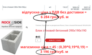 У підсумковій відомості ресурсів стіновий блок 390х190х190 врахували по 6 284 грн/куб. м (тут і далі ціни наведені з ПДВ та без доставки, яка в кошторисі оплачується окремо). Компанія «Rockside» та «Київбуд» продають його по однаковій ціні 3 195 грн/куб. м, що вдвічі дешевше.