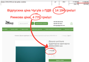 Що до устаткування, то магнітну шкільну дошку вписали по 14 194 грн/шт, тоді як їхні ринкові ціни ‒ 3 500 грн/шт, 4 490 грн/шт, 4 770 грн/шт, що майже втричі дешевше.
