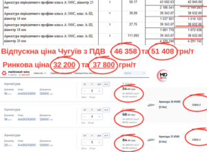 Арматуру періодичного профілю А500С класу А-ІІІ діаметрів 12-20 мм вписали по 46 358 грн/т, 25 мм ‒ по 51 408 грн/т (тут і далі ціни та суми вказано з ПДВ). «Метінвест СМЦ» в Харкові таку продає по одній ціні ‒ 34 200 грн/т, «Іronworld» ‒ по 34 160 грн/т, «МД Істейт» арматуру 12-18 мм в Харкові продає по 32 200 грн/т, а діаметром 20-25 мм ‒ по 37 800 грн/т. Тобто ринкові ціни нижчі на 25-30%.