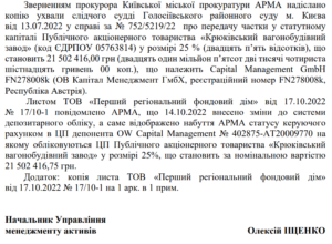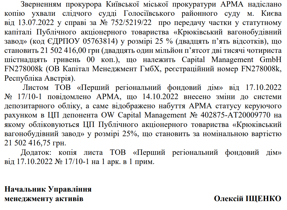 Фірма завантажила лист від АРМА голові правління «КВБЗ» Максиму Крамаренку про те, що суд 13 липня 2022 року передав АРМА в управління частку в 25% акцій «КВБЗ», яка належить австрійській компанії «OW Capital Management GmbH». До цього листа додано лист до АРМА від депозитарія ТОВ «Перший регіональний фондовий дім» про набуття АРМА статусу керуючого рахунком у цінних паперах «OW Capital Management GmbH».