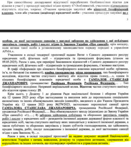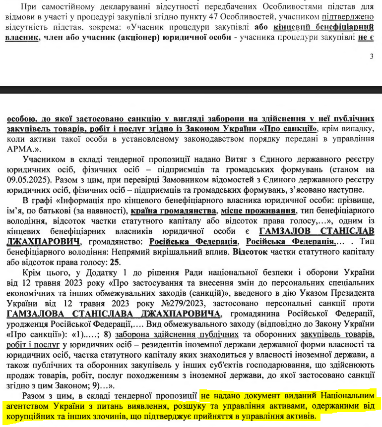 На нинішньому тендері кременчуцьке ТОВ «Інструментальний завод» пропонувало згадані ланцюги Кр.ЕТ.04А.00.000 виробництва своєї материнської компанії «КВБЗ» на 4% дешевше – за 16,30 млн грн. Однак його відхилили, оскільки одним із його кінцевих бенефіціарів через «КВБЗ» є росіянин Станіслав Гамзалов, на якого РНБОУ наклала санкції. Замовник написав у протоколі, що в складі тендерної пропозиції не надано документ, виданий Національним агентством України з питань виявлення, розшуку та управління активами, одержаними від корупційних та інших злочинів (АРМА), що підтверджує прийняття в управління акцій компанії.