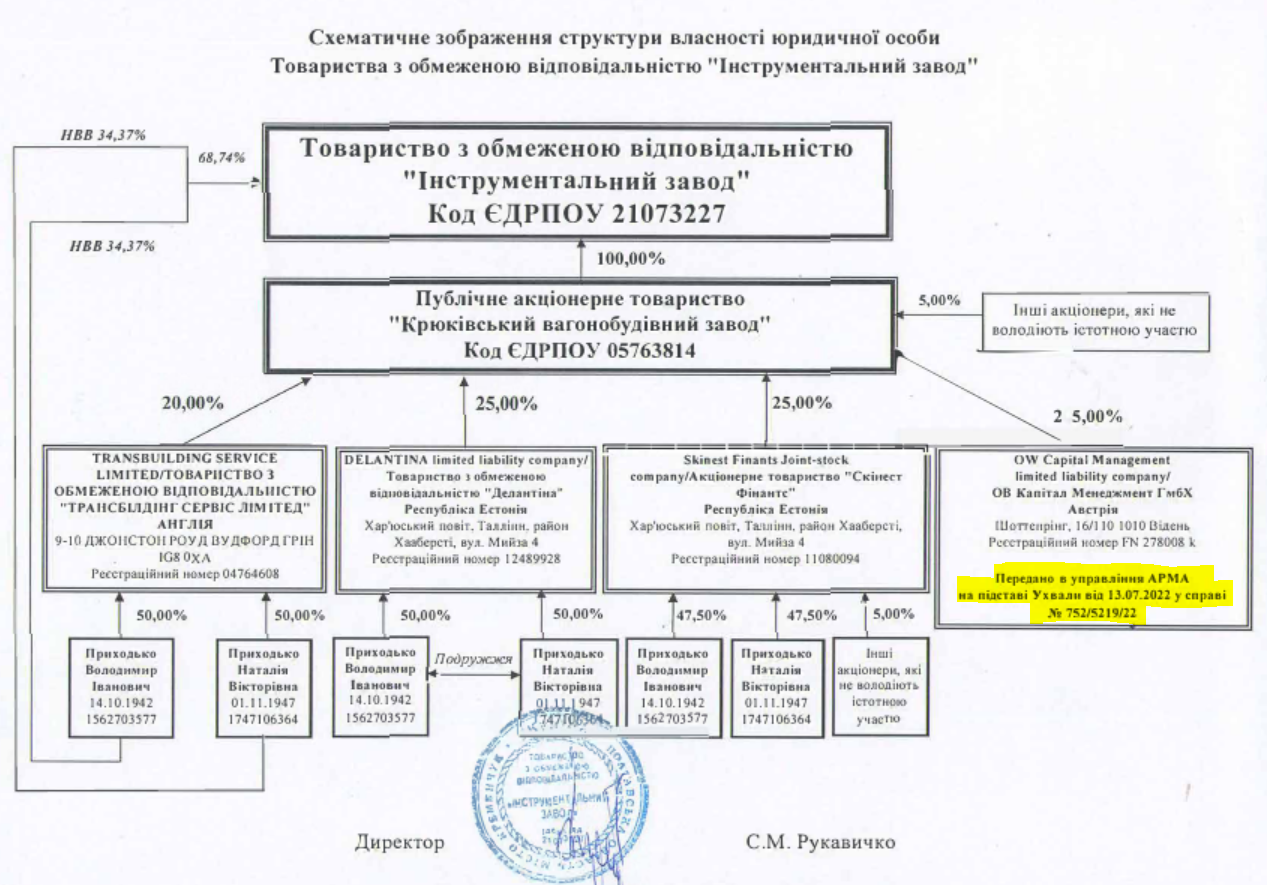 Ще «Інструментальний завод» завантажив у «Прозорро» три судові ухвали: від 19 травня 2022 року про арешт 25% акцій «КВБЗ», що належать «OW Capital Management GmbH», і 100% статутного капіталу «Інструментального заводу», що належать «КВБЗ», а також від 13 липня 2022 року про передачу цих 25% акцій «КВБЗ» в управління АРМА. В цих ухвалах зазначається, що «OW Capital Management GmbH» підконтрольна Станіславу Гамзалову.