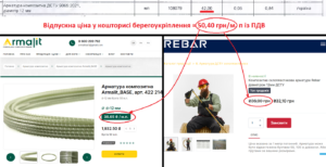 «Епіцентр» в Одесі пропонує українську композитну арматуру Rebar Pro такого діаметру довжиною 1–1,5 м по 36 грн/п. м. На сайті самого виробника «Коте Юніон» композитна арматура Rebar такого діаметру за ДСТУ бухтами по 50 м чи 100 м або прутами потрібного покупцю розміру коштує 32-36 грн/п. м залежно від наявності знижки. Інший виробник «Армалітас» продає композитну арматуру Armalit_BASE такого діаметру за ДСТУ 9065:2021 бухтами по 50 м за ціною 39 грн/п. м. Це в середньому на чверть дешевше від кошторису.