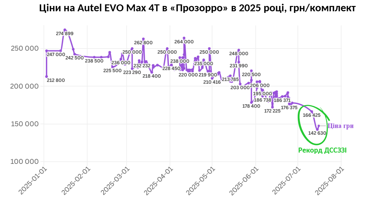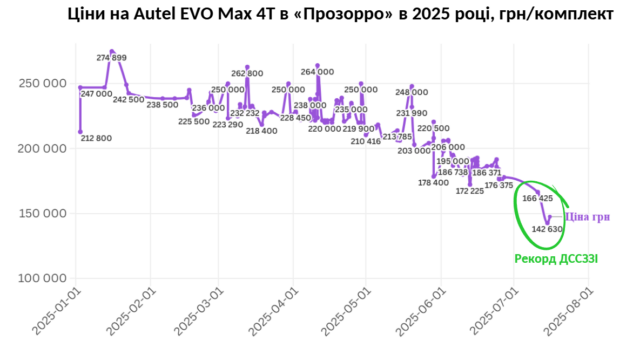 «Наші гроші» проаналізували ціни на цю модель дронів в «Прозорро» від початку року і всі три ціни є рекордно низькими.