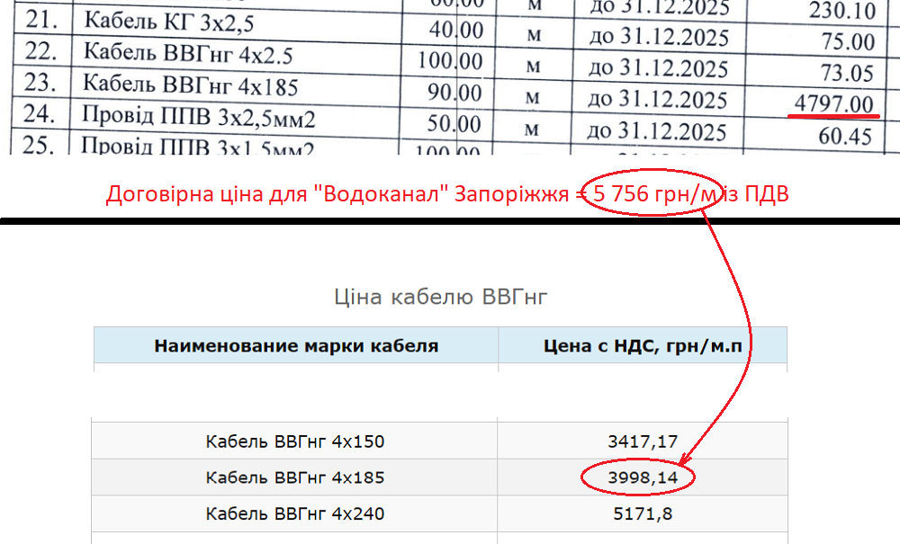 Наприклад, найбільша сума 518 тис грн припадає на силовий кабель ВВГнг 4х185, судячи з наданого паспорту якості, виробництва ТОВ «Торговельний будинок «Енергоальянс», по 5 756 грн/м. Але крупний постачальник кабельно-провідникової продукції «Укрпровід» у липневому прайс-листі пропонує такий кабель по 3 998 грн/м, тобто на 31% дешевше.