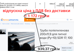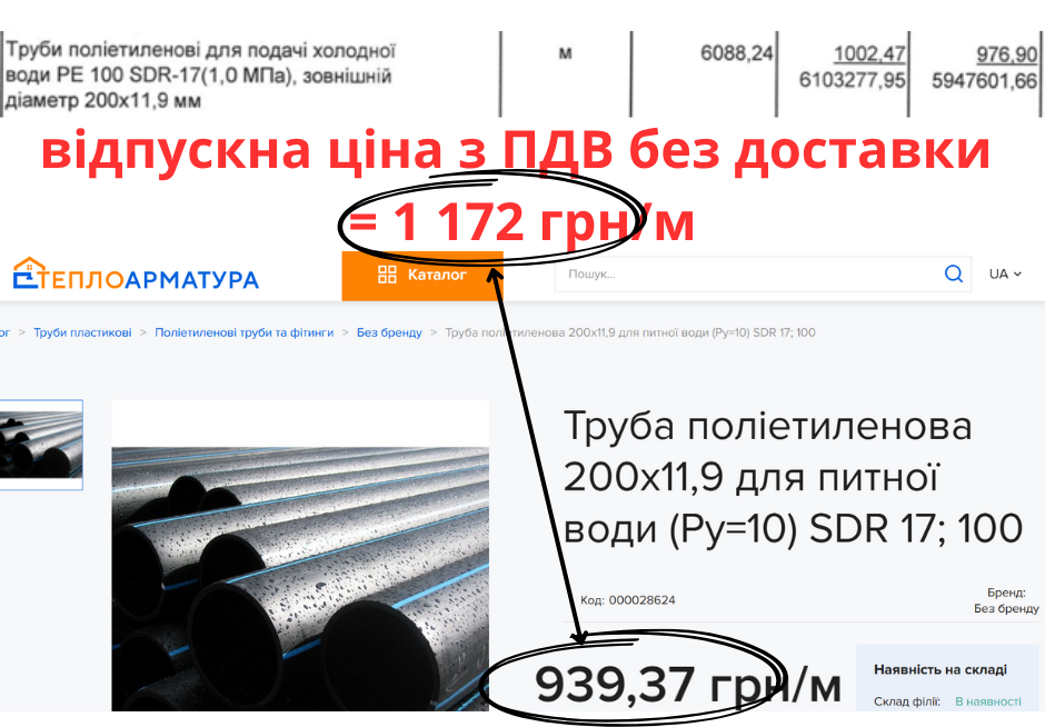 У підсумковій відомості ресурсів поліетиленові труби для води PE 100 SDR-17 діаметром 200х11,9 мм врахували по 1 172 грн/м (тут і далі ціни вказані з ПДВ). Однак виробник «ТрубПолімерГруп» пропонує такі труби по 633 грн/м, а «Теплоарматура» – по 939 грн/м. Це на 20-46% дешевше. Нещодавно КП «Тернопільводоканал» замовив виробнику «Ельпласт-Львів» труби PE 100 SDR-17 діаметром 200х11,9 мм по 592 грн/м, що вдвічі дешевше.