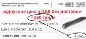 Кабель ВВГ нгд 3х1,5 кв. м замовили по 260 грн/м. «Укрпровід» продає його по 38 грн/м, що більше ніж вшестеро дешевше. Нещодавно Служба відновлення у Сумській області для ремонту будинку замовляла такий кабель по 33 грн/м, а Буринська міськрада Сумської області для ремонту харчоблоку ліцею №1 по 34 грн/м.