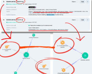 Пошук в сервісі «YC World» по «Renorm Limited» знаходить дві кіпрські компанії з такою назвою та різними реєстраційними номерами, про те однаковими зв’язками.