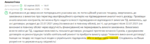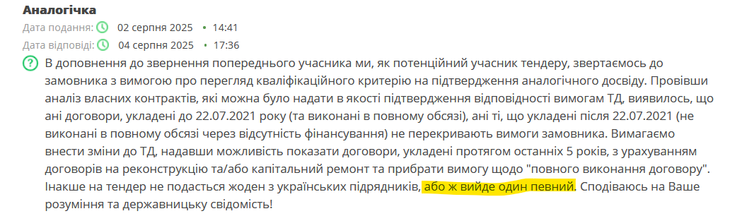 Одна з фірм жалілась, що у неї є подібний контракт, але він був укладений раніше від 5 річного терміну. А той, що був укладений в строк – виконаний не повністю через відсутність фінансування з боку замовника (під час вторгнення багато довоєнних підрядів були заморожені). Відтак потенційний учасник прогнозував, що на цей тендер прийде лише одна українська компанія.