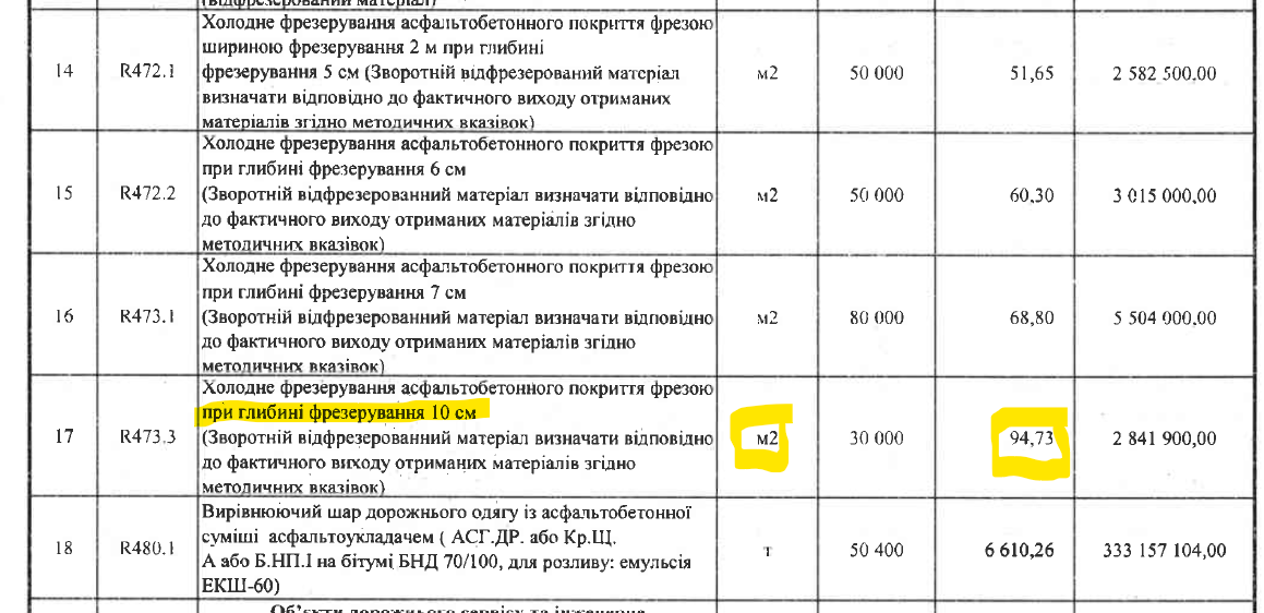 Натомість можна співставити вартість фрезерування покриття (зняття старого слою асфальту, яке не залежить від географічних нюансів у вартості будматеріалів). В обох кошторисах вказані ціни за фрезерування 1 кв м. І на Миколаївщині розцінки виявились у півтора рази більшими. Наприклад, фрезерування асфальту товщиною 10 см для «Ростдорстрою» коштуватиме 94,73 грн, а рівненці оплатять його «Автостраді» по 61,47 грн за квадратний метр.