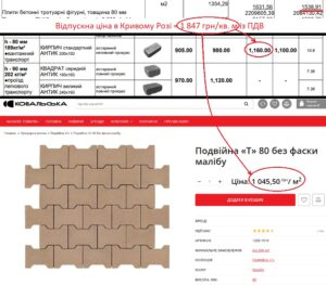 Фігурну тротуарну бетонну плитку товщиною 80 мм врахували у кошторис по 1 847 грн/кв. м (тут і далі ціни та суми вказано з ПДВ). У прайс-листі виробника «Золотий мандарин» найдорожча плитка такої товщини коштує 1 160 грн/кв. м, а в «Ковальської» – 1 046 грн/кв. м, що в півтора-два рази дешевше. Днями на тендері «Західного реабілітаційно-спортивного центру» фігурна тротуарна бетонна плитка товщиною 80 мм із бетону В30 М400 МР3200 була майже втричі дешевшою – 636 грн/кв. м, а в серпні на тендері в Новокалинівці на Львівщині у 3,5 раза дешевшою – 503 грн/кв. м.