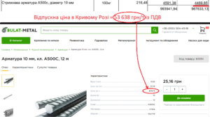 Наприклад, стрижнева арматура А500с діаметром 10 мм врахована по 53 640 грн/т. Фірма «Булат-Метал» пропонує її по 32 500 грн/т, що в півтора раза дешевше. Крім того, в серпні на тендері Київської ОДА щодо укриття школи в селі Загальці біля Бородянки арматура А500с різних діаметрів від 10 мм до 32 мм теж була врахована приблизно по 33 тис грн/т.