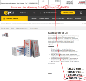Кілька кубометрів пінополістирольних плит XPS Carbon Prof 1180x580x30 L врахували по 58 189 грн/куб. м. Ціна виглядає так, наче в ній помилились на цілий розряд. Адже в різних інтернет-магазинах трохи товщий утеплювач XPS Carbon Prof 40 мм продають по 180 грн/кв. м. Його упаковка має площу 6,85 кв. м та об’єм 0,274 куб. м. Тобто в перерахунку упаковка коштує 1 233 грн, а ринкова ціна кубометра складає 4 500 грн, що майже в 13 разів дешевше.
