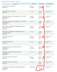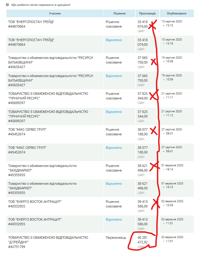 На тендер розміром 40,28 млн грн прийшло семеро учасників, але шестеро дешевших відмовились від підписання договорів. Це були ТОВ «Енергопостач Трейд», ТОВ «Ресурси батьківщини», ТОВ «Гірничий ресурс», ТОВ «Мікс Сервіс Груп», ТОВ «Західмаркет» і ТОВ «Енерго Восток Антрацит» із цінами 9 872-11 644 грн/т із ПДВ.