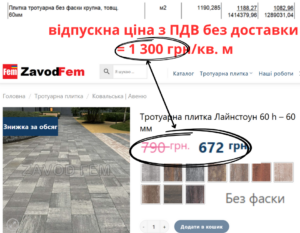У підсумковій відомості ресурсів крупну тротуарну плитку без фаски 60 мм замовили по 1 300 грн/кв. м (тут і далі ціни вказані з ПДВ без доставки). «ZavodFem» продає тротуарну плитку без фаски Лайнстоун 60 мм по 790 грн/кв. м, а «Київбуд» пропонує плитку цеглу Золотий Мандарин 60 мм по 800 грн/кв. м. Це на 39% дешевше.