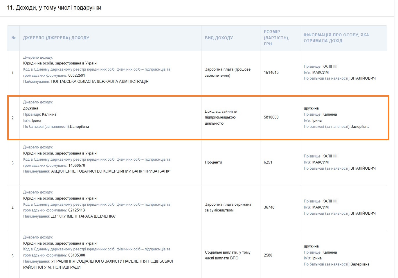 «Моя дружина дійсно займається підприємницькою діяльністю. Це відображено в моїй декларації. Не вбачаю в цьому якогось порушення. Відповідні податки сплачуються, бюджет поповнюється», – узагальнено відповів Калінін.