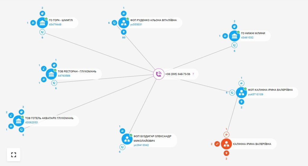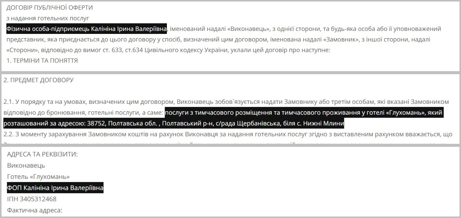 Журналісти знайшли договір оферти на сайті «Глухомані», де Ірина Калініна зазначена як надавачка послуг з тимчасового проживання в комплексі, через оренду номера в ньому. От тільки, для цього вона мала б мати у власності або оренді номери, яких офіційно не має. Її контактний номер ФОП збігається з контактами ТОВ «Ресторан Глухомань» і ТОВ «Готель Аквапарк Глухомань», а також з ФОП Альони Руденко – дружини брата Владислава Руденка Юрія.