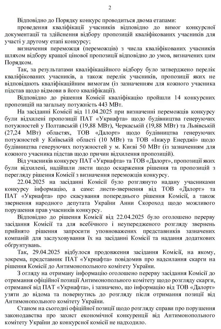 Але швидко завершити конкурс укладанням угод з переможцями не вдалось. Державна «Укрнафта», ТОВ «Інжур Енерджі» Андрія Журжія і ТОВ «Далорт» Євгена Воробйова подали пропозиції впритул до граничної ціни. Вони вказали свої ціни без ПДВ, тоді як треба було з податком. Відтак якщо додати до їх пропозиції ще 20% – вони банально перевищували граничну ціну і мали бути відхилена. Що зрештою конкурсна комісія і зробила. «Укрнафта» і «Далорт» поскаржились на це рішення в саму конкурсну комісію, також про це був лист від нардепки Анни Скороход. Комісія 22 квітня взяла тиждень на вирішення питання, а 29 квітня з’ясувалось, що «Укрнафта» вже сама поскаржилась на своє відхилення аж в Антимонопольний комітет.