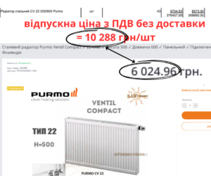 Стальні радіатори Purmo 500х800 CV 22 замовили по 11 535 грн/шт. «Sivtermo» продає такі по 6 950 грн/шт, а «Purmo.Lviv» пропонує їх по 8 930 грн/шт. Це на 23-40% дешевше.