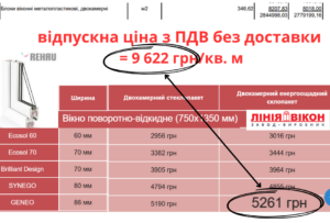 Невідомі металопластикові двокамерні вікна врахували по 9 622 грн/кв. м. «Лінія Вікон» продає вікна з двокамерним енергоощадним склопакетом профілю Rehau Geneo по 5 196 грн/кв. м, що майже вдвічі дешевше.