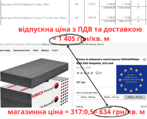 Полістирол EPS 200 Graphite 150 мм врахували по 1 405 грн/кв. м. Група компаній «Будівельна Гільдія» продає його по 634 грн/кв. м, що вдвічі дешевше. А «Компанія ЕОС» пропонує полістирол Hirsch EPS-200 наборним методом (50мм +100мм) по 765 грн/кв. м, що на 46% дешевше. З урахуванням прикладу військового містечка №9, де доставка екструдованого пінополістиролу становила 66 грн/кг, це значне завищення ціни.