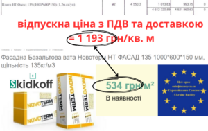 Плити НТ Фасад 135 150 мм замовили по 1 193 грн/кв. м (тут і далі ціни вказані з ПДВ). «Skidkoff» продає фасадну базальтову вату Новотерм НТ Фасад 135 150 мм по 534 грн/кв. м, а «Ітера Груп ЛТД» продає її по 765 грн/кв. м. Це на 36-55% дешевше.