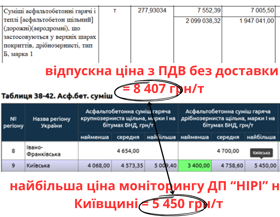 Дрібнозернистий асфальтобетон типу Б марки 1 врахували по 8 407 грн/т. За даними серпневого моніторингу ДП «НІРІ», на Київщині ціни дрібнозернистого асфальтобетону марки 1 різнились від 3 400 до 5 450 грн/т, що на 35-60% дешевше.