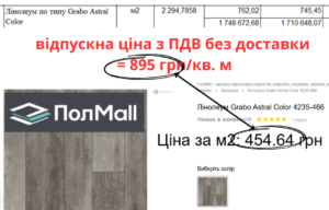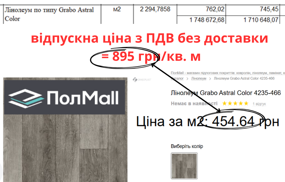 Лінолеум Grabo Astral Color врахували по 895 грн/кв. м. Компанія «Parketti» продає таки й по 334 грн/кв. м, а «ПолMall» по 455 грн/кв. м. Це в 2-2,5 раза дешевше.